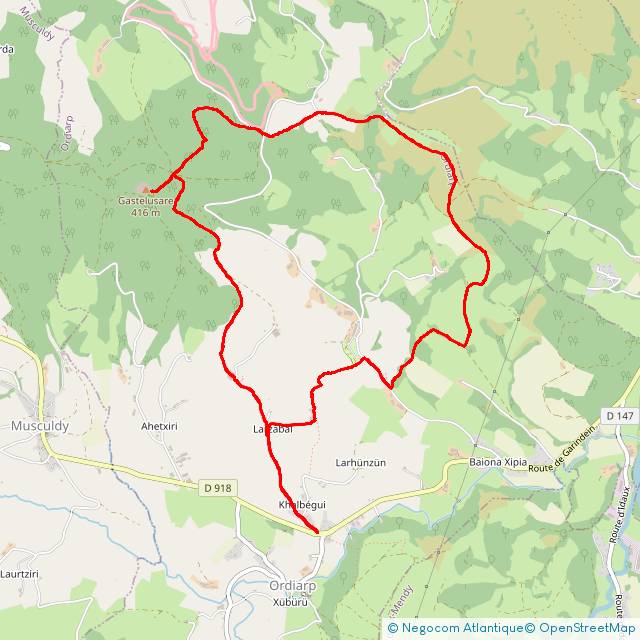 Cette belle balade, très variée, traverse le village d’Ordiarp pour monter progressivement jusqu’à la chapelle de Saint-Grégoire. Elle se déroule dans une zone intermédiaire de sous-bois et de pâturages de moyenne altitude. Il n’est pas rare de rencontrer des vaches et des chevaux en liberté. Le sommet offre une vue grandiose à 360° avec les Pyrénées au Sud, la vallée de Lambarre (un quartier d’Ordiarp) et la plaine au Nord. Du sommet, on distingue très nettement le site protohistorique tout proche de Gaztelüzarre.