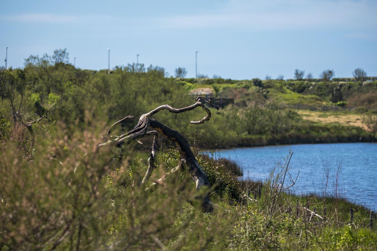 En quittant le bâtiment, je traverse la Chambre de la Vanne qui établie la connexion entre le lac Nord et l’océan via l’Adour. Dans cette eau transparente et peu profonde, toute une population de crabes, de crevettes et de petits poissons (des anchois par exemple)cohabite et interagie. Le chemin contourne alors le lac Nord, proposant des haltes autour d’affûts aménagés pour l’observation des oiseaux. Je me délecte du panorama souligné par ce lac qui s’étend à perte de vue, agrémenté de la visite de quelques volatiles.