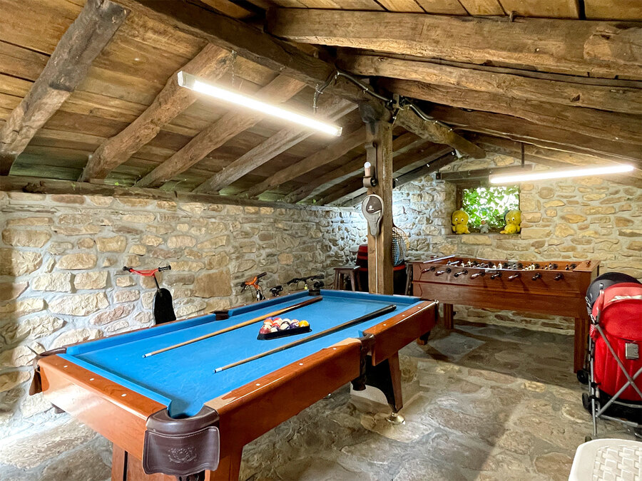Il y a aussi un barbecue couvert avec des tables et des bancs. Egalement un ping-pong, un baby-foot, un billard et un parc pour les enfants (jeux pour les enfants, balançoires, toboggans, tyrolienne...), un panier de basket et des buts de foot.